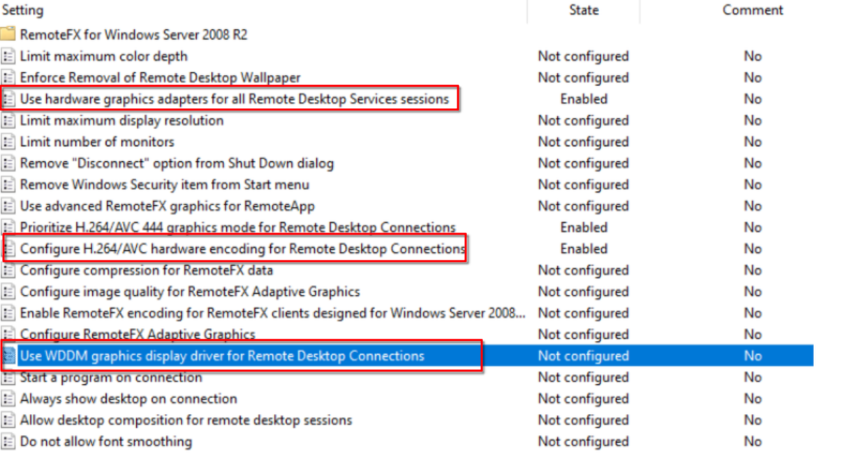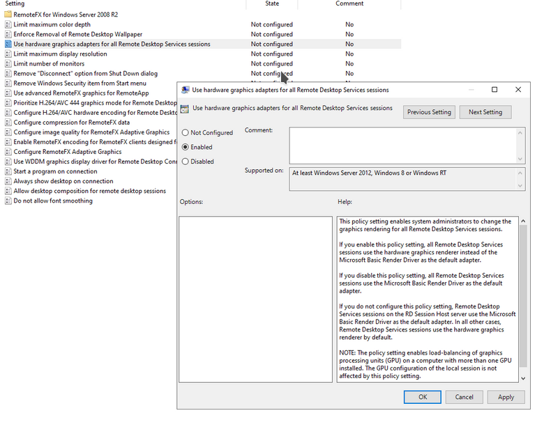 Locate the policy setting: Use hardware graphics adapters for all Remote Desktop Services sessions.